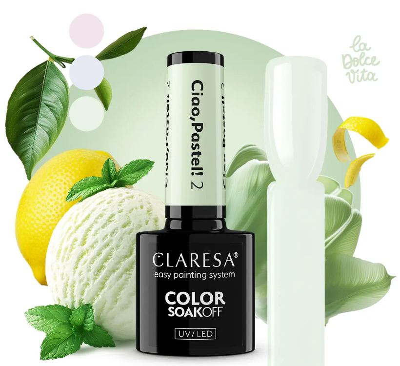 CLARESA Ciao, Pastel! 2 je jemný pastelový světle zelený gelový lak s krémově mléčným podtónem. Tento svěží odstín působí lehce, přirozeně a dodá vaší manikúře jemný jarní charakter. Pastelově zelená je ideální pro minimalistický styling a moderní barevné kombinace.