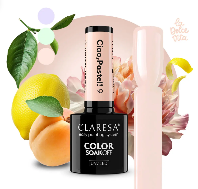 CLARESA Ciao, Pastel! 9 je jemný pastelově broskvově nude gelový lak s krémově mléčným podtónem. Tento elegantní odstín kombinuje přirozenost nude barev s jemným teplým broskvovým odstínem, který dodává manikúře svěžest a přirozenou eleganci.
